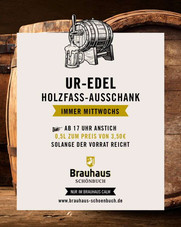 UR-EDEL HOLZFASS-AUSSCHANKImmer Mittwochs: UR-EDEL Holzfass-Ausschank. Ab 17 Uhr Anstich.0,5 Liter zum Preis von…